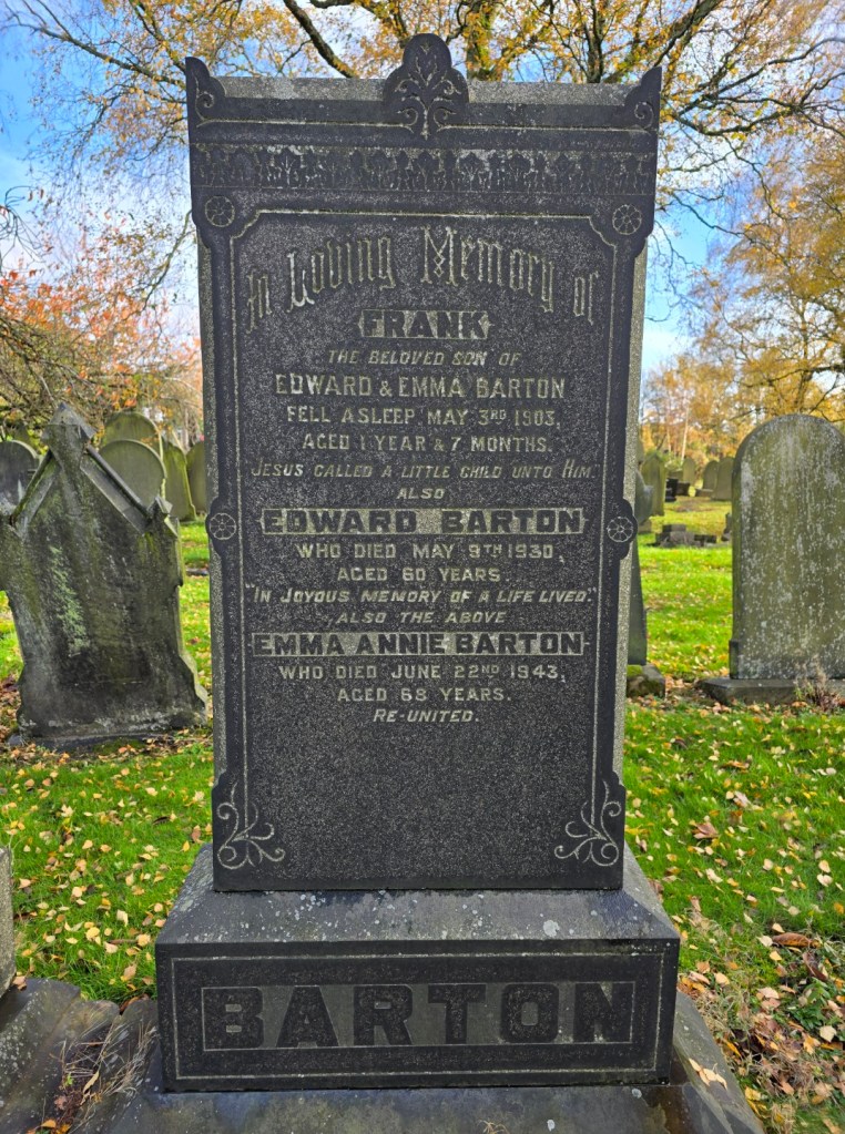 1943 This is the gravestone of Edward and Emma in Lower Ince Cemetery, son Frank is also mentioned maybe he was moved.