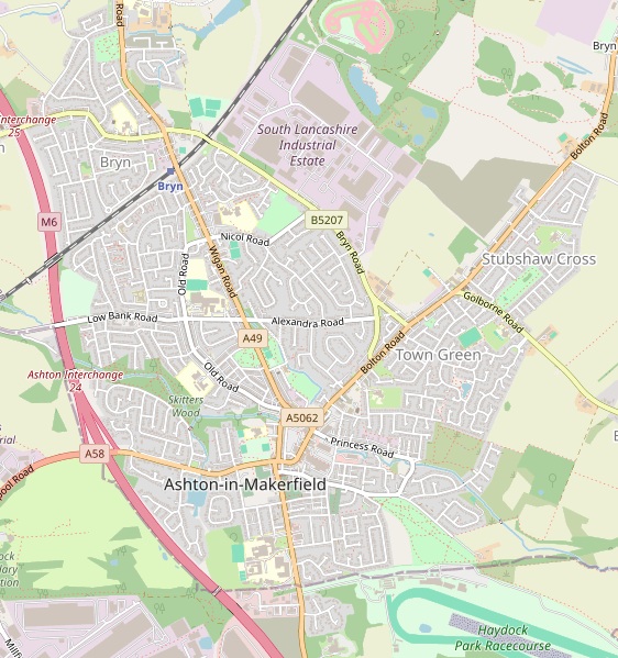 Ashton In Makerfield is a town to the north east of St Helens and south of Wigan. References to Ashton In Makerfield in certificates and censuses often encompass the nearby smaller towns of Garswood and Haydock, but in this web site a distinction is made between all three areas. The northernmost part of Ashton In Makerfield is known as Bryn.