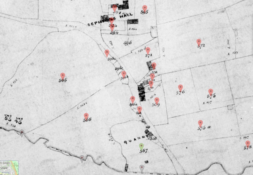 - 565: “Steal Field” occupied by Thomas Wilkinson (living “near Sephtons Hall” in the 1841 census), owned by Lord Skelmersdale