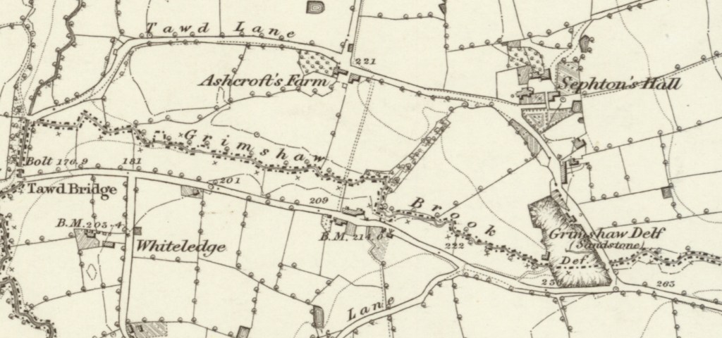 Grimshaw was an area of rural Skelmersdale that contained a quarry (or “delf”). There was also a house or farm to the north east of the delf. This was near the Grimshaw Brook and Tawd Lane. In the same area were Sephtons Hall, Ashcrofts Farm and Whiteledge.