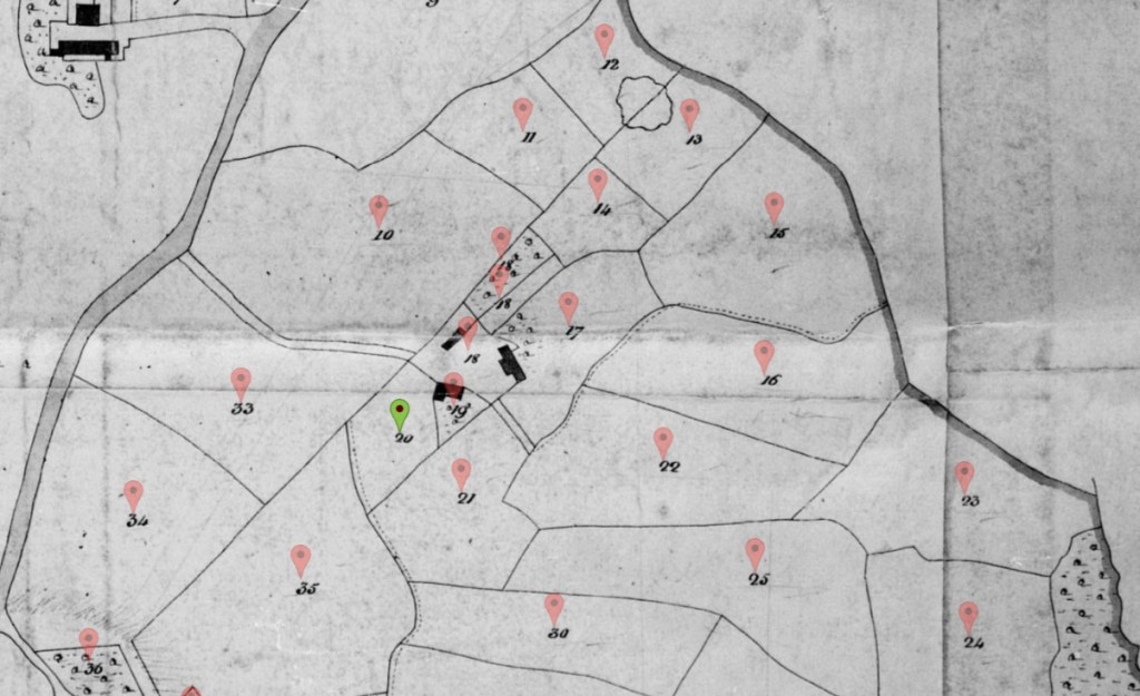 In the Tithe Maps of 1838 (found on The Genealogist web site) there is no Edward Nixon but his father John Nixon occupies 17 plots numbered 10 to 23, 25, 33, 34 around Jamesons Farm which are on the Tithe Map image below, corresponding to the area in the 1890 map above. The owner was Meyrick Bankes who was the lord of the manor at Winstanley Hall and who also ran Winstanley Colliery. See Wikipedia for further information.