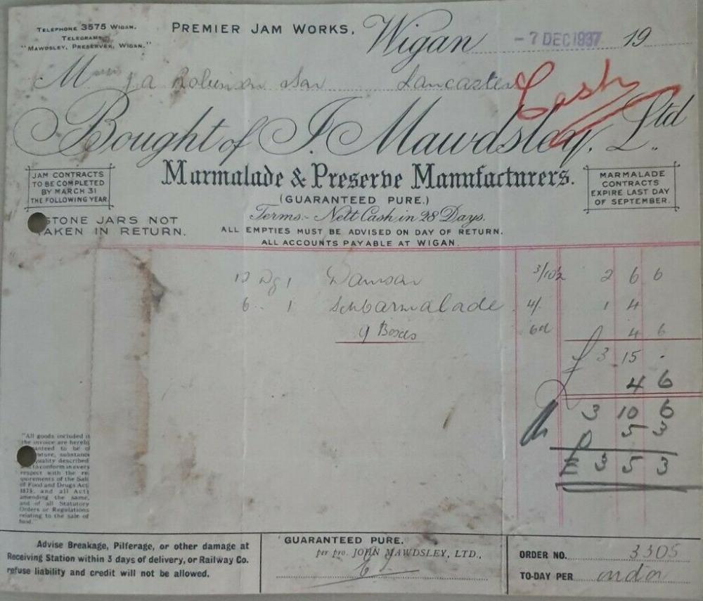 By the 1891 Census John and his family were living in Mill Yard Princess Street, which is presumably somewhere in or near the “Premier Jam Works” since that was built on the site of the old Princess Street Mill, as shown in this 1890 map of Wigan. The invoice shown below proves that the Mawdsley business was run from “Premier Jam Works”.