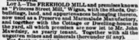 John rented the area of the Jam Works, and in 1894 the Freehold of the Jam Works was put up for sale, this from Wigan Examiner of 14th July 1894