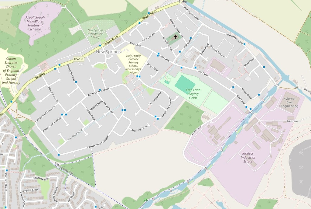 New Springs is a neighbourhood at furthest north east from Central Wigan, bounded by Leeds & Liverpool Canal to the north and east and the Whelley Loop Line to the south and east.