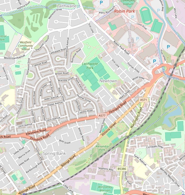 Newtown is a neighbourhood to the west of Central Wigan bounded by a park to the north, the Robin Park commercial park to the east, a railway line to the south and Sherwood Drive to the west.