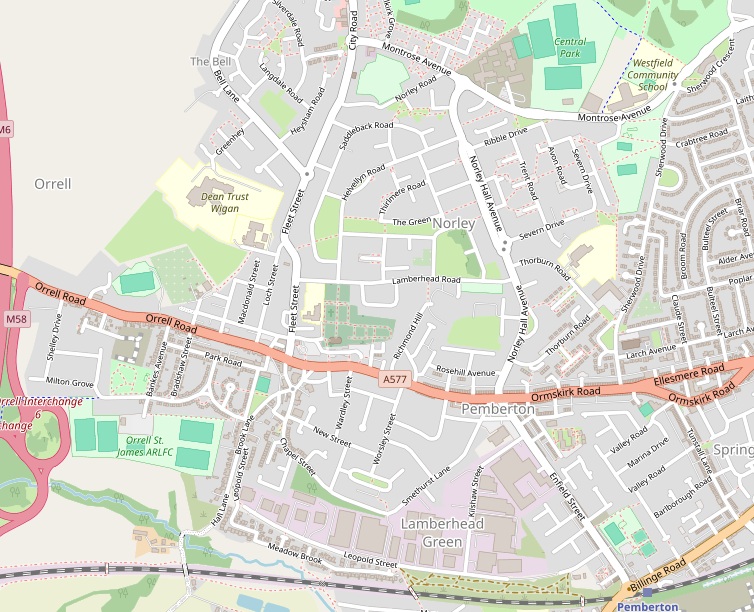 Pemberton is a neighbourhood to the west of Central Wigan bordered by Montrose Avenue to the north, Sherwood Drive to the east, a railway line to the south and the M6 to the west.