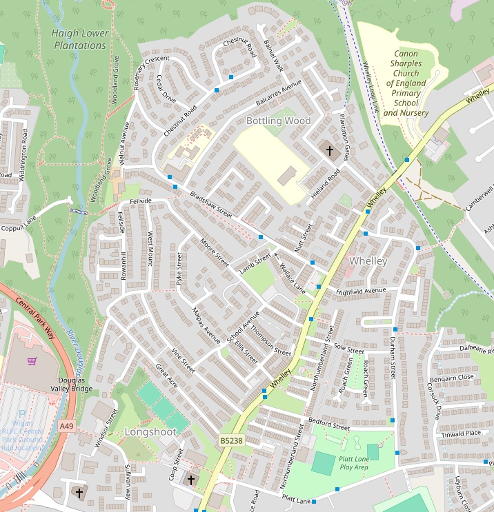 Whelley is a neighbourhood to the north west of Central Wigan bounded by Haigh Plantations to the north, Whelley Loop Line (disused railway) to the east, Longshoot bowling greens and Platt Lane Play Area to the south and the River Douglas to the west.